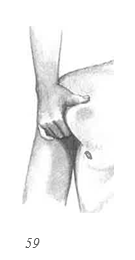 Massez l’espace entre chaque doigt près de la première articulation en entrelaçant les doigts de votre main libre avec celle du patient (fig.78). Pour terminer, agrippez le poignet avec le pouce et l’index de votre autre main. Pressez alternativement sur l’avant et l’arrière de la main et des doigts, travaillant chaque articulation. Puis tordez et tirez à nouveau les doigts. Après avoir tiré chaque doigt, secouez votre propre main.